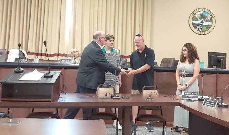Councilman Brian Lynch and Vice President Natalie Buccieri awarded The Tracks Deli owners with the appreciation award from Vernon Township. Councilman Lynch told all in attendance that he spoke to Jahnke before the meeting, and said that if you knew Kevin, he mirrors Scott, and Scott did not want to be here tonight. He is not the type of person that stands around waiting for accolades when he does something right.”